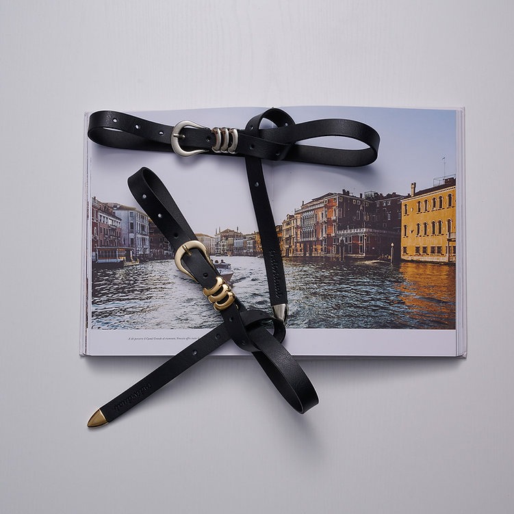 Handcrafted adjustable leather belt with gold or nickel metal details.
